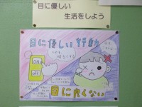 保健室前の掲示板に「目に優しい生活をしよう」というテーマで、ポスターが貼ってあり...