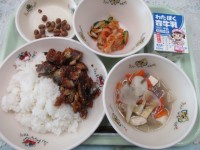 今日の給食の献立は、・中華丼・コーンと卵のスープ・ポップビーンズ・牛乳です。2月...