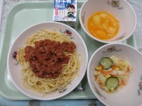 今日の給食の献立は、・スパゲッティミートソース・フレンチサラダ・オレンジポンチ・...