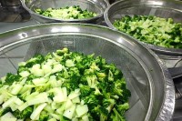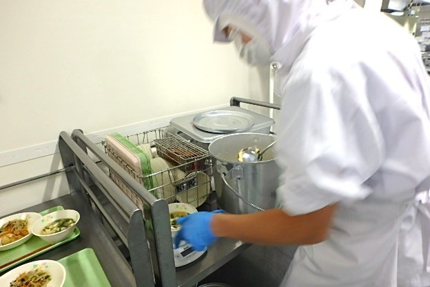 写真は、給食の写真をとるために、分量を量って盛り付けているところです。