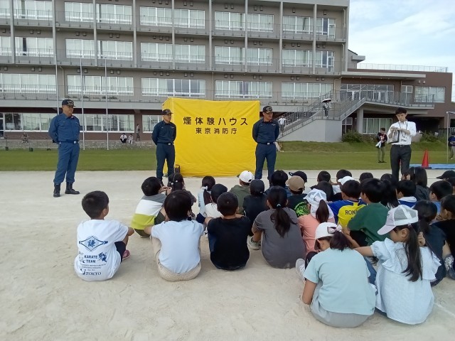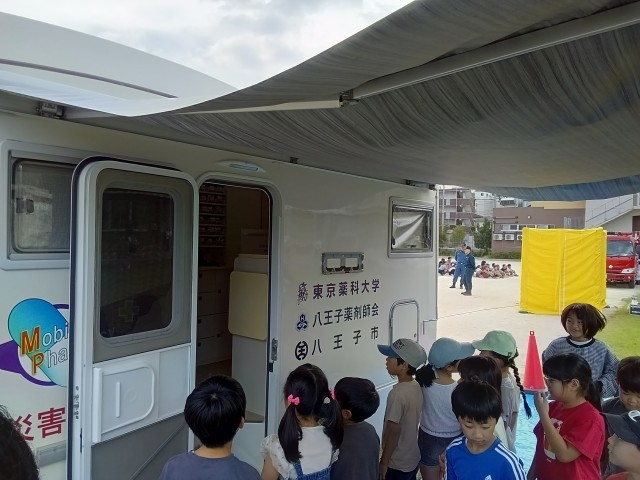 本日は、3・5・8年生が、八王子消防署や消防団、薬剤師、防災・災害ボランティアなどの方々に防災訓練のご協力をいただき、体験学習を行っています。