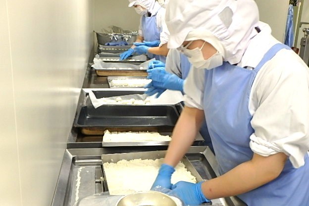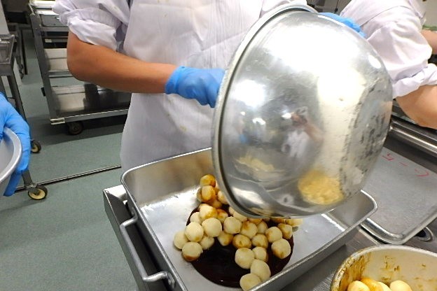 お団子は、給食室で上新粉と白玉粉を合わせて豆腐を加えてこねて、3070個のお団子をつくりました。一人2個ずつ配ってください。