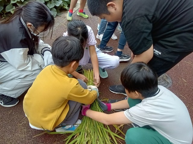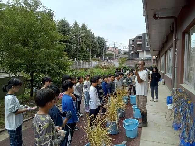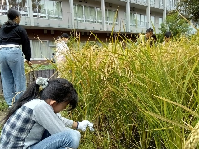 実りの秋です。ビオトープの田んぼの稲刈りをしました。「ゆぎのら」の方々に、鎌の使い方や刈り取った稲の結び方などをご指導いただき、友達とも協力したがら体験することができました。来週は脱穀作業をする予定です。