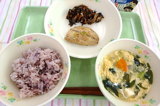 古代米ごはん あじのねぎ塩焼き かきたま汁 ひじきの炒め煮 牛乳