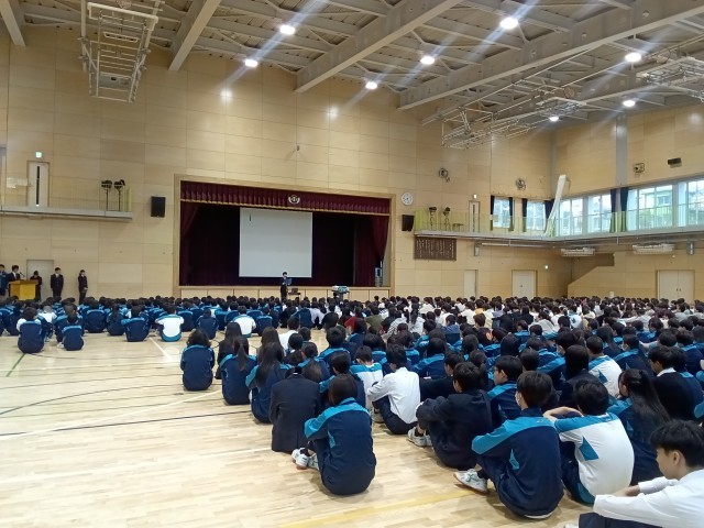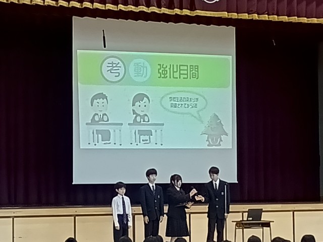 児童生徒会朝会では、「考動強化月間」のお知らせがあり、より主体的な学校生活を呼びかけていました。