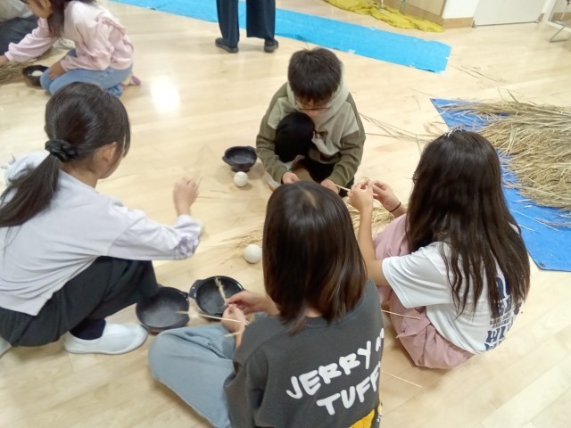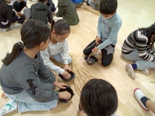 5年生は、収穫した稲の脱穀と籾摺りをしました。軟式野球のボールとすり鉢で丁寧に作業しました。