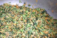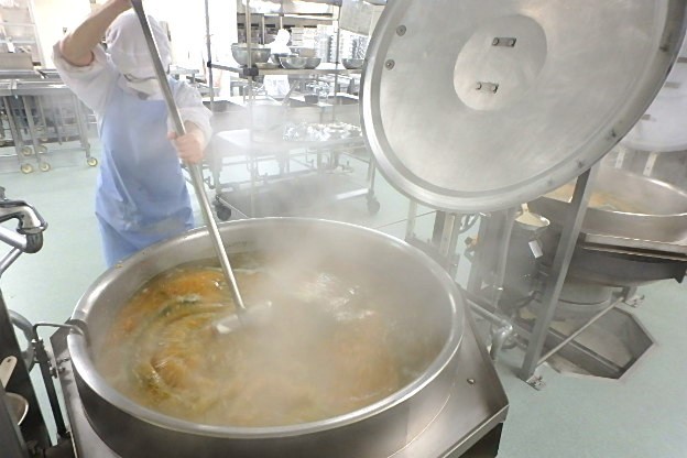 たまねぎを炒めると茶色になっていきます。こうすることで甘くおいしく、風味が増すので、今日の料理の他にもカレーやミートソースでも作っています。給食のおいしさの秘訣のひとつです。