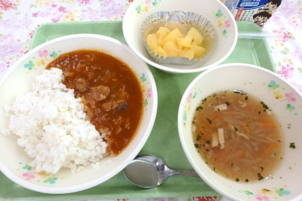 ハヤシライス オニオンスープ 焼きりんご 牛乳です