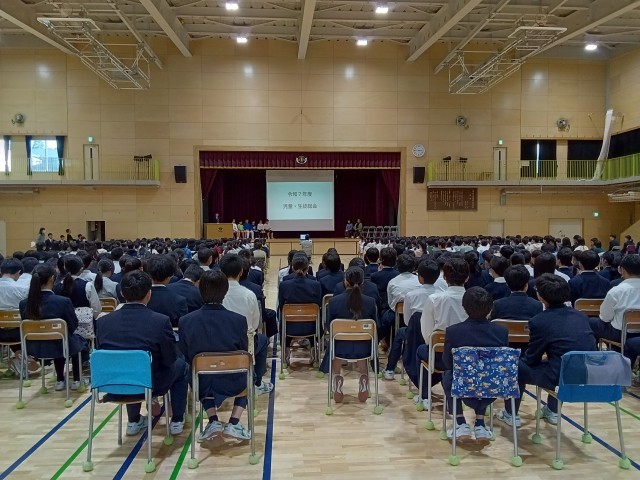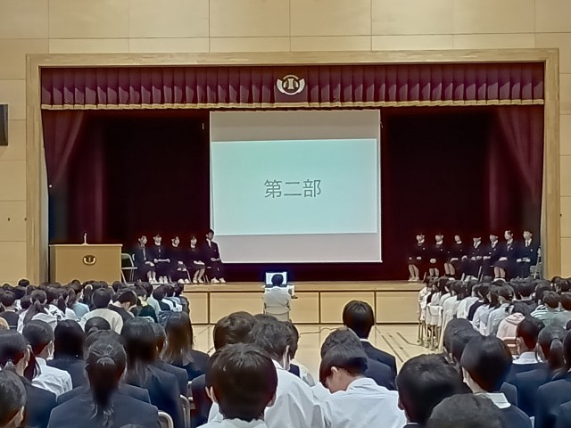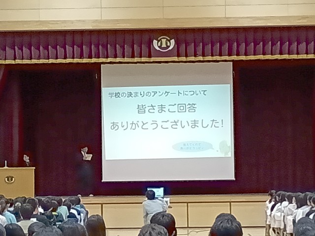 本日6校時に、児童・生徒会総会を行いました。2部構成で、第1部は前期委員会委員長による発表、第2部は、児童・生徒会執行部、各学年・学級委員会、後期委員会委員長による発表が行われました。最後に児童・生徒会執行部から、昨年度改訂した学校のきまりについてのアンケート結果の発表がありました。自由には責任が伴うことを自覚し、これからも「考動」し続けましょうと伝えました。校長先生は、さらに本校がよくなる期待を抱かせる内容で、Ⅰ期の後輩のことも考えた話し合いの内容に触れ、「未来はみなさんの手で創ってください」と子供たちにエールを送られました。