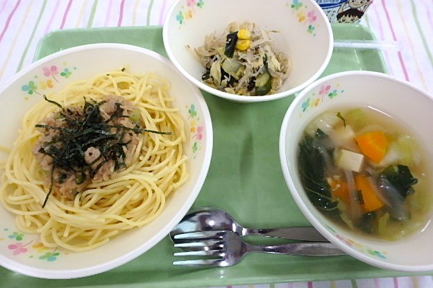 はち大根おろしスパゲティ 豆腐とチンゲンツァイのスープ わかめじゃこサラダ 牛乳です
