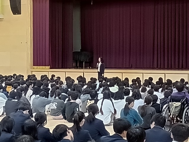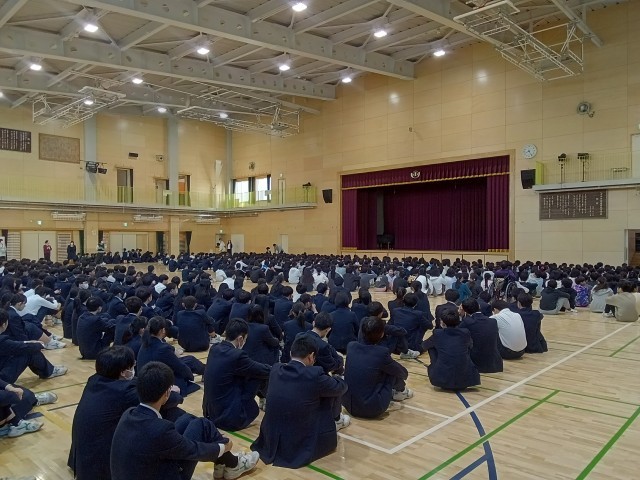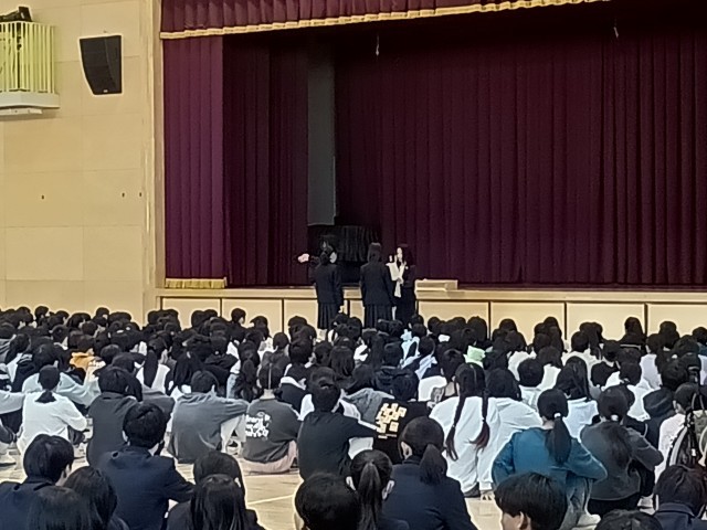 【Ⅱ・Ⅲ期】朝会 公開日 2025/12/08 更新日 2025/12/08 今日のできごと Ⅱ・Ⅲ期朝会を行いました。校長先生からは、人権週間についてのお話がありました。自分を大切にすることと同じように、仲間を大切にしてほしいと伝えられました。具体的にはあいさつをすることで相手を認めることにつながること、友達のよいところを見つけることも含めて、温かいことばでいっぱいになるように、みんなで意識していきましょうと話をされました。最後に、書道、作文、部活動で活躍した生徒の表彰を行いました。