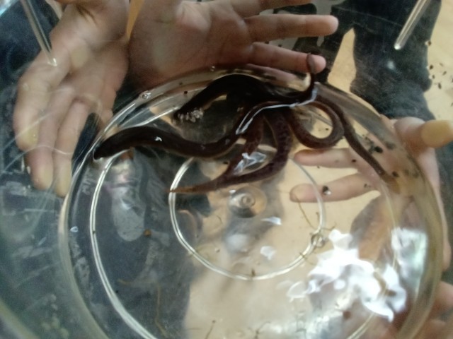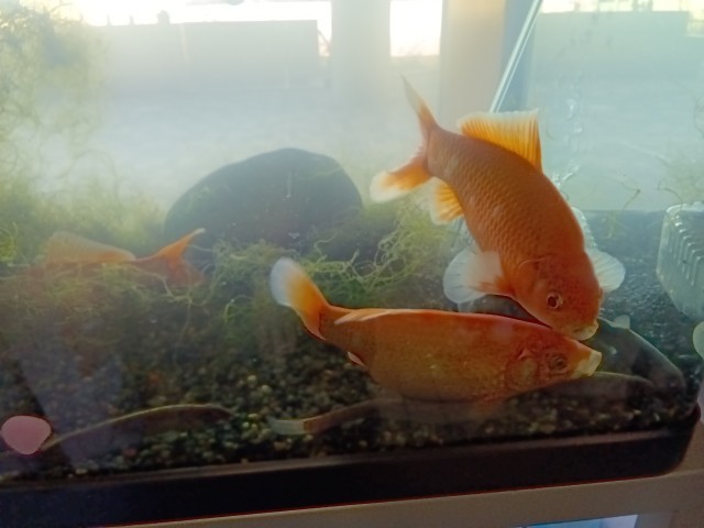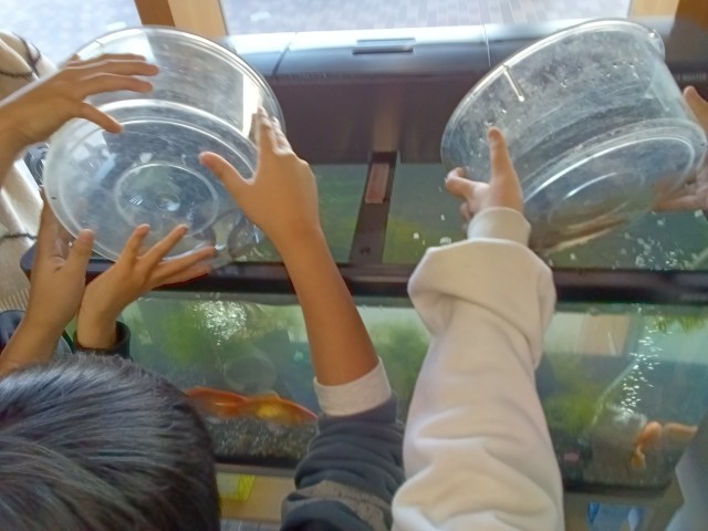 【全校】水槽引越し 公開日 2025/12/10 更新日 2025/12/10 今日のできごと 先日、お伝えした新しい水槽に金魚とドジョウのお引越しをしました。古い水槽では、藻が生えていて中の様子が分かりにくかったのですが、実はドジョウもいるのです。これからはよく見ることができますね。今日の委員会活動で整備委員会の皆さんが、引越し作業をしてくれました。ありがとうございました。