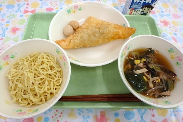 給食では麺をスープに入れてしまうと、汁を吸ってのびてしまうので、つけ麺にしました。