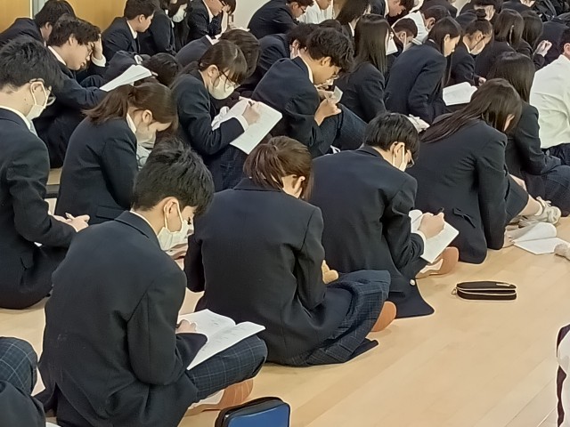 まずは、班別の隊形に並び、点呼の練習をしました。その後、メモを取りながら真剣に3日間の行程を確認することができました。