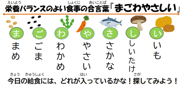 食育メモにある栄養バランスの良い合言葉は「まごわやさしい」これはそれぞれの食べ物の頭文字です。今日の給食に何が入っているか探してみてください。