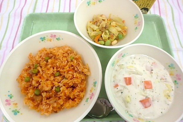 チキンライス クリームシチュー まめまめサラダ みかんジュースです