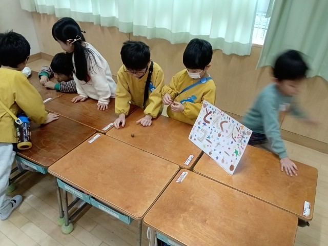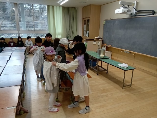 4月から新1年生として入学する年長児に、学校生活について紹介したり、体験してもらったりしました。掃除の仕方や、給食白衣の着方など、教えることが盛り沢山ですが、そこはさすがの1年生です。みんなで協力しながら、自分の担当をしっかりと務めていました。お兄さん、お姉さんとして優しく教える姿に、1年間の成長を改めて感じました。