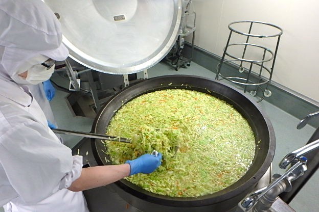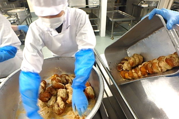 パン屋さんから届いたパンを給食室でさっと揚げて、きなこをまぶします。