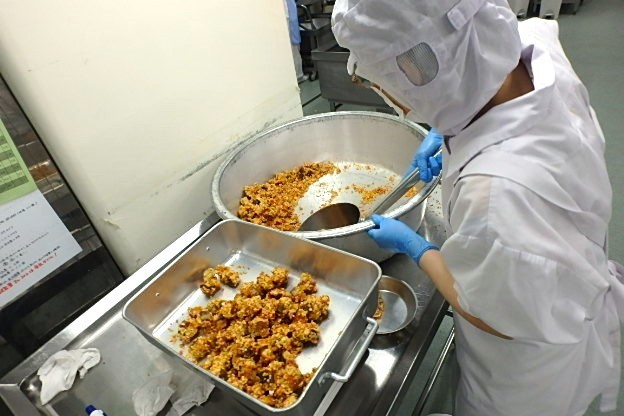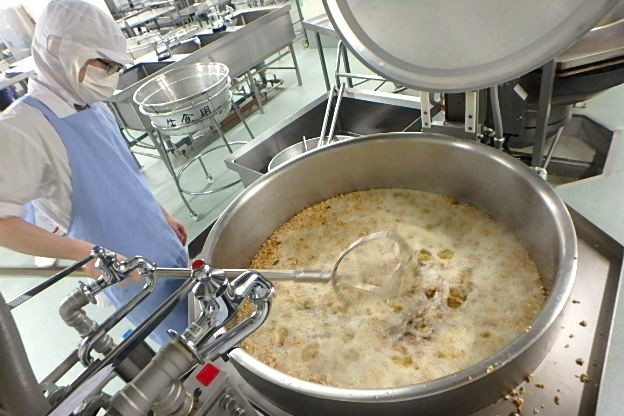 寄居町のトントロリンスープは、本来豚肉に片栗粉をまぶしてお肉がトロリンとしているスープなのですが、いずみの森の給食室の場合では、スープにとろみをつけています。八王子産の野菜をたくさん入れて作りました。