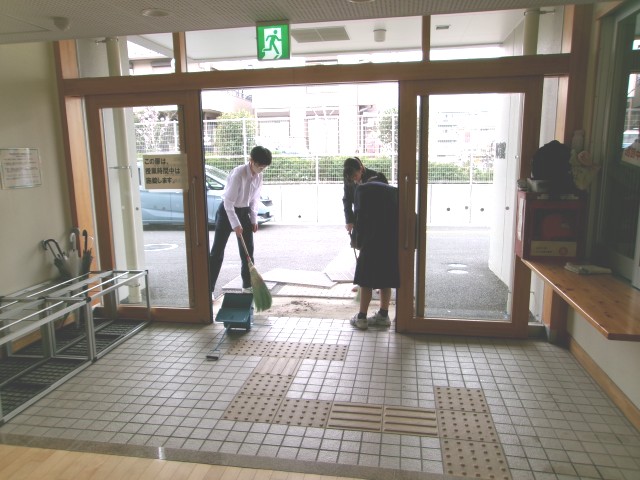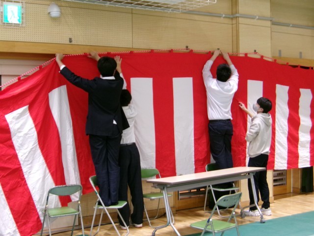 紅白幕を張ったり、イスをキレイに並べたり、廊下や入口などの掃除も行いました。