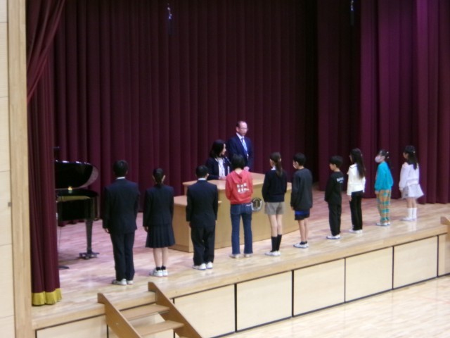 1年生から8年生までの児童・生徒が集まり、4年生と7年生の代表児童・生徒の言葉の後、各学年と7組の代表児童・生徒に校長先生から修了証が授与されました。