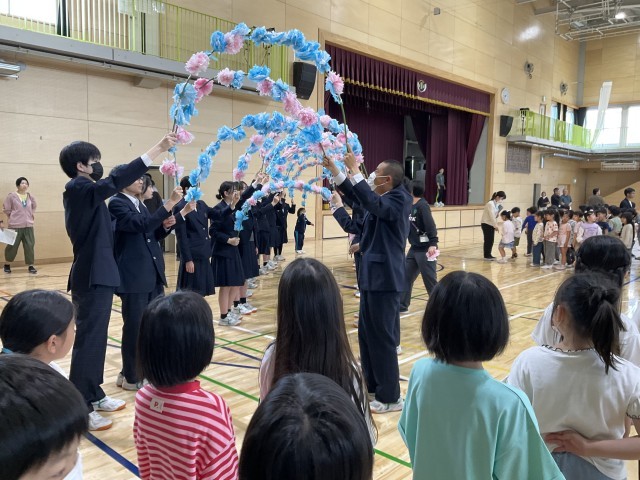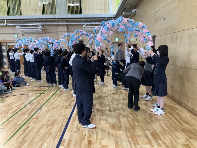 8年生が花のアーチをつくります。