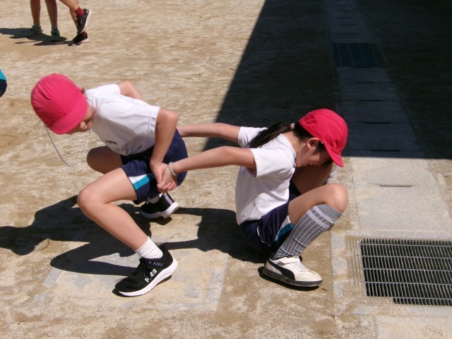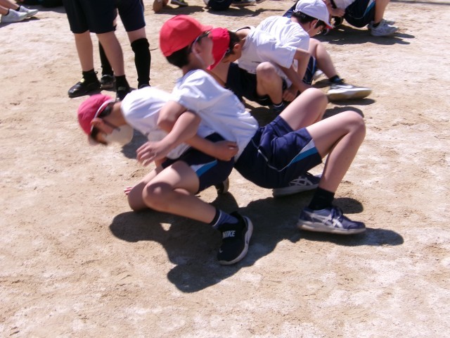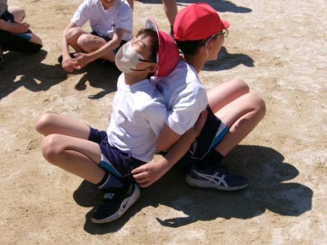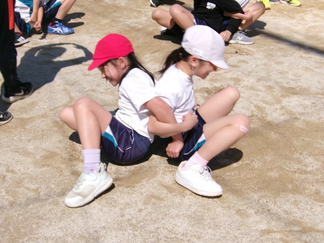 背中合わせになって立つ運動ですが、なかなか難しいようです。