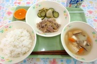 4月27日(月)ごはん 豚肉の生姜焼き 田舎汁 きゅうりと大根の南蛮漬け 果物(...