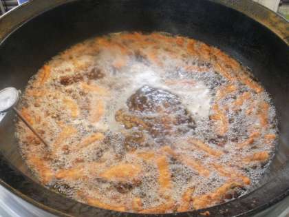 たっぷりの油で揚げています。