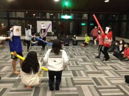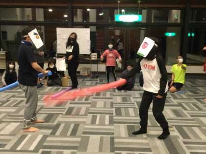 鈴音を頼りに、目隠しをしてウレタンの棒でたたくゲームのようです。