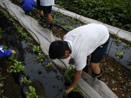 9/26 小雨の降りしきる中、スクールファームでは、大根芽のまびき作業をしました。まびいた芽は、お土産としました。今年も立派な大根が収穫できることを期待しています。