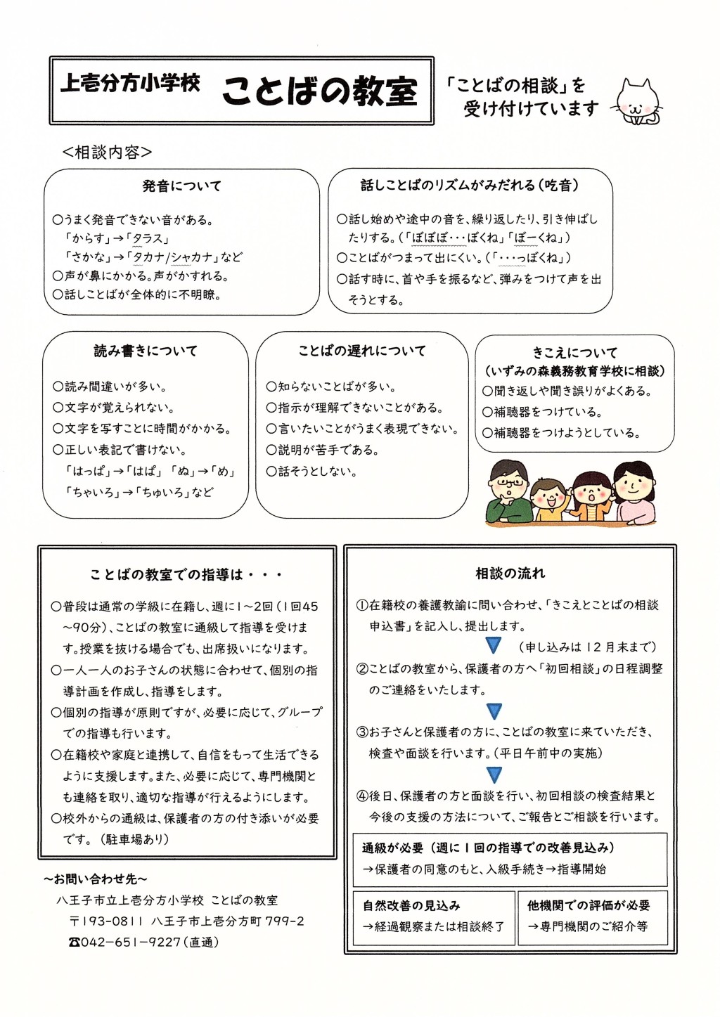 ことばに課題のあるお子さんを対象とした「ことばの相談」を行っています。この相談では、ことばの検査や保護者の方への聞き取りを行い、お子さんがより良い学校生活を送るための手立てについてお話しさせていただいています。週に1回の指導が必要と思われるお子さんにつきましては、ことばの教室での指導をお勧めしています。