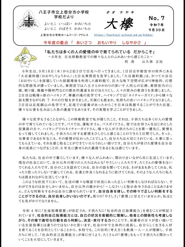令和7年度、上壱分方小学校が重きをおいていることは、毎号の学校だよりに朱書きしてある通り「あいさつ 思いやり しなやかさ」。これらはいずれも、他者とのかかわりの中で育まれる(非認知)能力です。