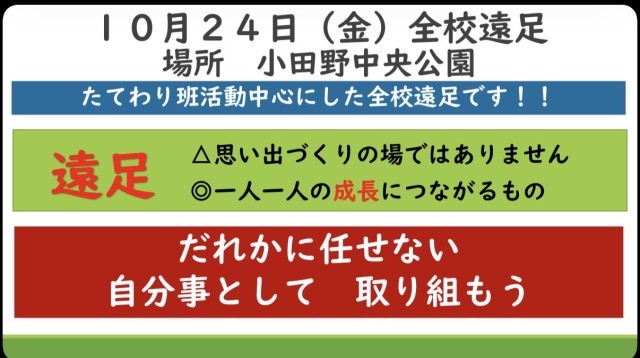 10/24は全校遠足があります。思い出づくりの機会ではなく、成長につながる機会としましょう。