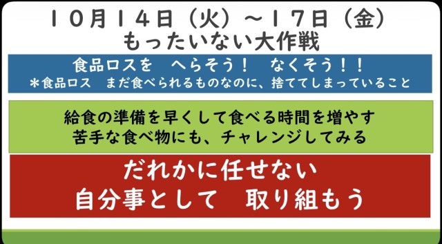 10/14からのもったいない大作戦ウィークで残菜量を見つめ直し、減らすには、一人一人は何ができるでしょうか。