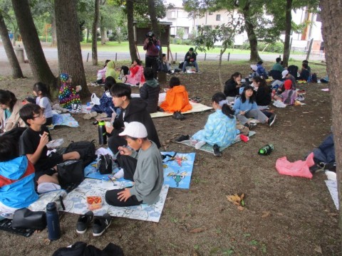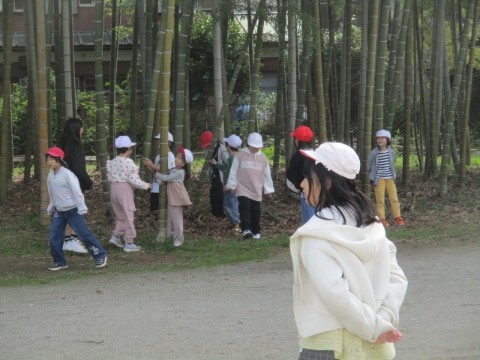 たてわり班ごとに高学年を中心にすぐに雑木林や竹林へ行き、雨宿りをしました。