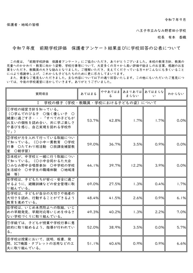 令和7年度(後期)学校評価保護者アンケート結果並びに学校回答の公表について