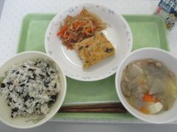 〈メニュー〉・わかめとむぎのごはん・卵焼き・豚汁・野菜のおかかあえ・牛乳〈八...