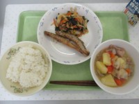 〈メニュー〉・ごはん・ししゃものかおりあげ・塩肉じゃが・わかめサラダ・牛乳〈...