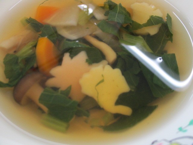 お吸い物には、イチョウ型ともみじ型のかまぼこが入っています。