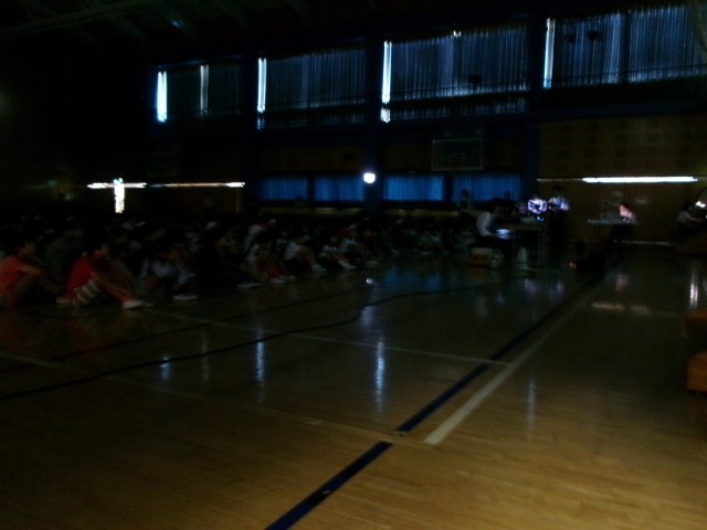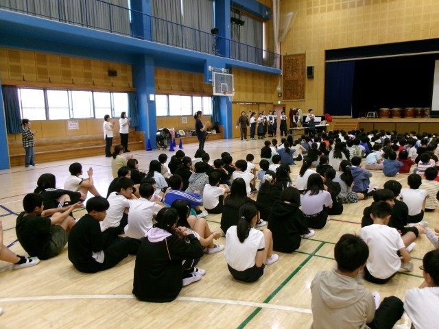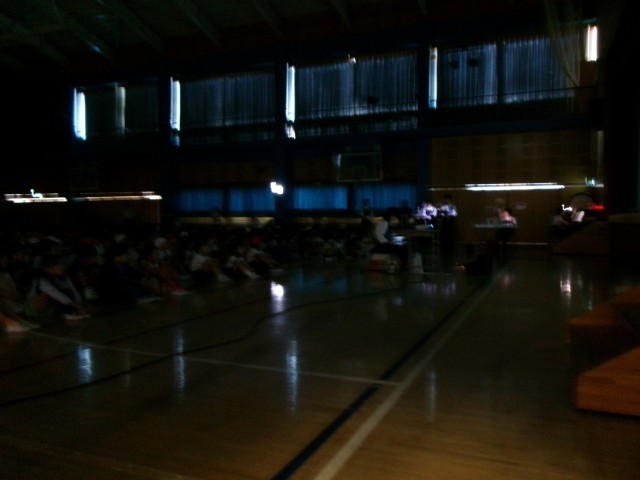 体育館に集まって、全校児童で読み聞かせを聞きます。