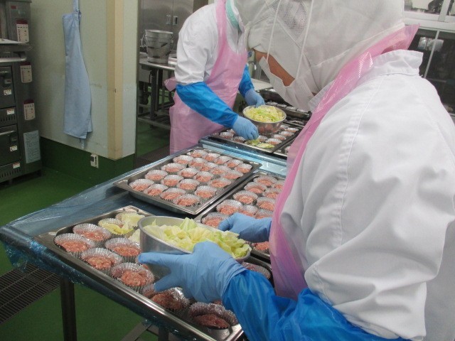 肉団子をキャベツでまく作業が大量調理だと難しかったので、肉団子の上にきゃべつを重ねて蒸し焼きにしました。