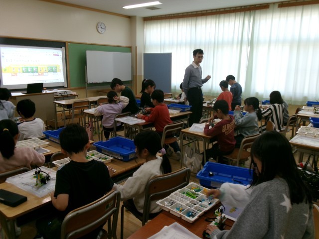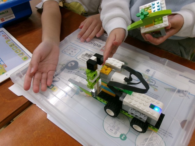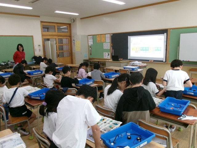 レゴブロックを使ってロボットをくみ上げ、そのロボットを思い通りに動かすためにプログラミングを組んでいきます。思い通りに動いてくれないロボットをどうプログラミングすれば思い通りに動かすことができるのか。トライ&エラーを繰り返しながら、プログラミング的思考を育む取組です。