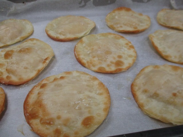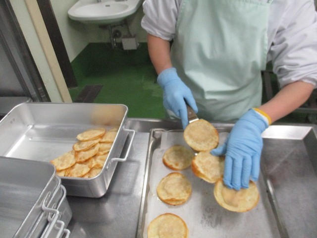 給食用にじゃがいもも混ぜたハムチーズポテトをぎょうざの皮ではさんで焼きました。