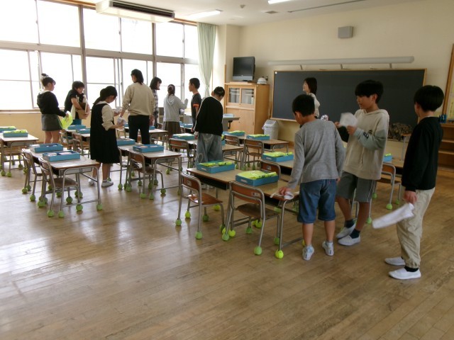 始業式の後、明日の入学式に向けて、6年生が会場準備に取り組みました。