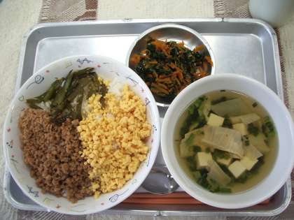 三色ごはん、ゆばのすまし汁、野菜のごまあえ、牛乳です。三色ごはんは、とりにく、いりたまご、くきわかめの三色をごはんにのせて食べました。