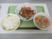 ごはん、ちくわの2色揚げ、とりじゃが、のりのつくだに、牛乳です。ちくわの2色あげは、あおのりとすあげの2色です。