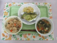 たこめし、揚げボールのにもの、とりじる、三色ナムル、牛乳です。半夏生の日です。関西であは、たこを食べる風習があります。うどん、さばなど食べるものは、地域に違いがあります。