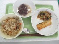 ごはん、しろみざかなのごまがらめ、もずくスープ、やさいのごまあえ、牛乳です。君田小の人気のメニューです。