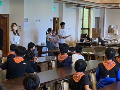 午後のお茶を受け取り、マリン体験のための着替えに行きます。